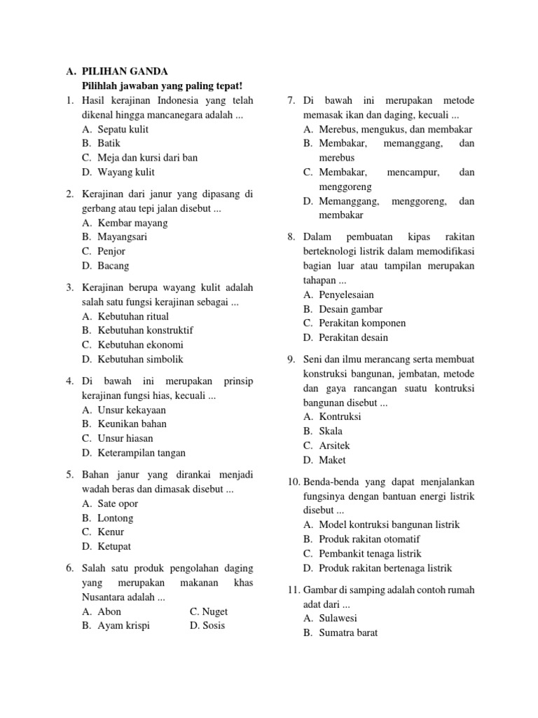 Benda benda kayu dan benda batu d. Aug 20, 2021 · soal penilaian tengah semester prakarya kelas 8 smp/mts semester 1 kurikulum 2013 ini berbentuk pilihan ganda dengan empat alternatif jawaban. Tanpa adanya kunci jawaban maupun pembahasan. Soal nomor 1 bahan serat adalah salah satu bahan yang sangat praktis dan tersedia banyak di sekitar kita untuk dimanfaatkan menjadi produk kerajinan diantaranya adalah …. Mar 07, 2021 · berikut dibawah ini, contoh soal pg prakarya kelas ix semester ganjil edisi revisi kurtilas dilengkapi kunci jawaban dengan pertanyaan dimulai dari nomor 11.
